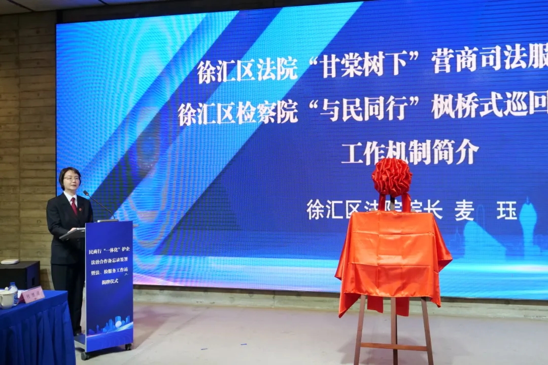 徐汇区法院院长麦珏介绍区法院“甘棠树下”营商司法服务工作站和区检察院“与民同行”枫桥式巡回服务站工作机制。