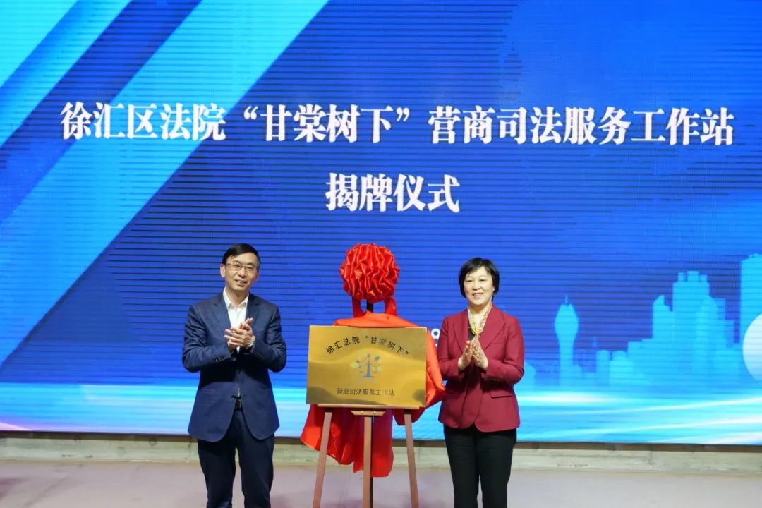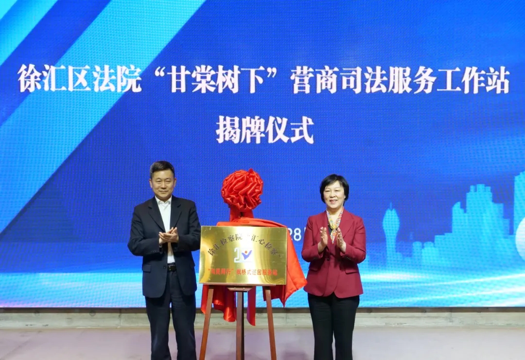 上海市高级人民法院党组成员、副院长林晓镍,徐汇区委常委、统战部部长秦丽萍为区法院“甘棠树下”营商司法服务工作站揭牌。