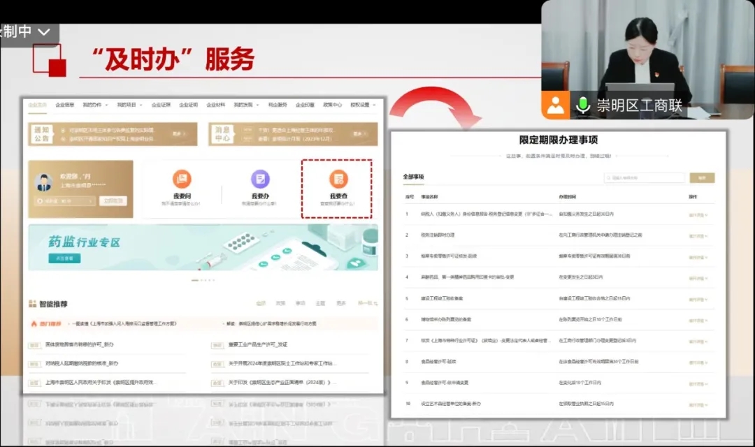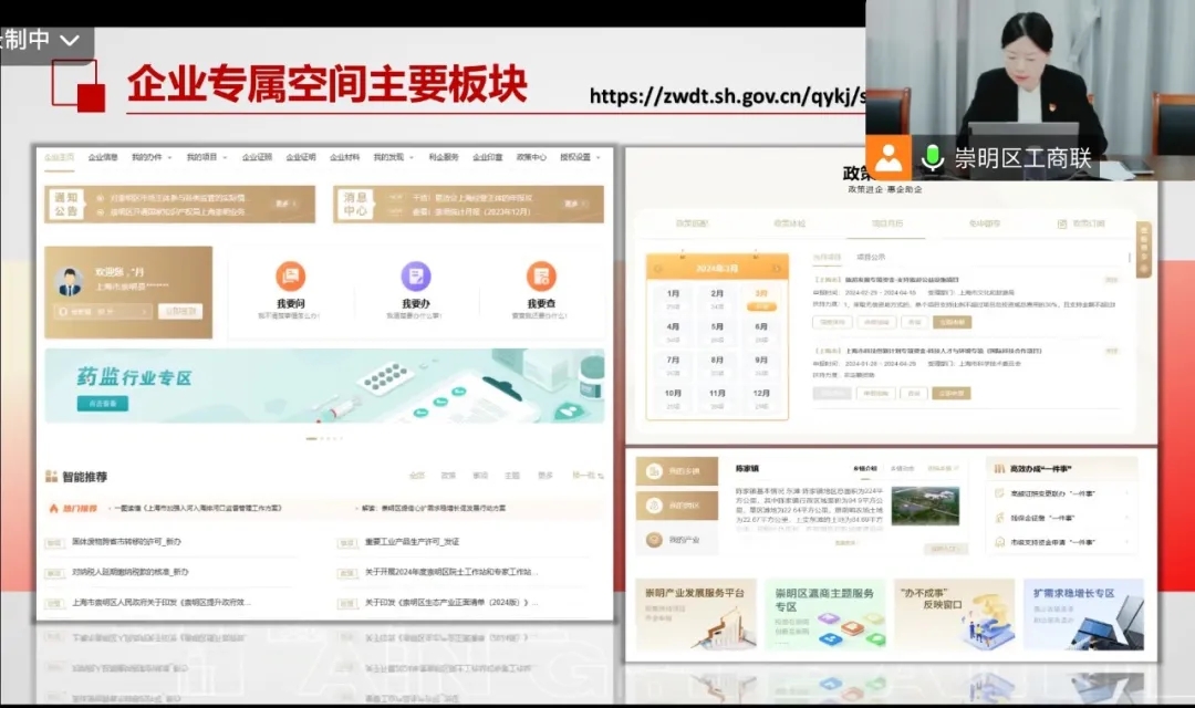 会上,区政务服务办围绕“一网通办”平台,详细讲解了崇明区企业专属空间的建设背景与目标、“一企一档”的个性化特点、主要功能板块和具体操作流程,并介绍了移动端服务载体和线上帮办服务。