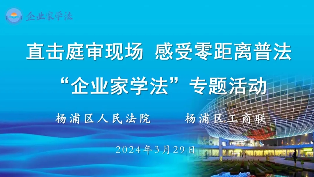 为深化公检法司联动协作,营造良好的法治营商环境,加大涉企普法宣传教育力度,引导民营企业合规经营,推动民营经济高质量健康发展,3月29日,杨浦区工商联联合区法院开展“直击庭审现场 感受零距离普法”暨“企业家学法”专题活动,邀请区政协工商联界别委员、区总商会、区青年商会企业家代表共同走进区法院庭审现场,旁听一起合同纠纷案件的庭审,“零距离”感受司法公开透明,为杨浦民营企业开展了一堂生动的“法治公开课”。