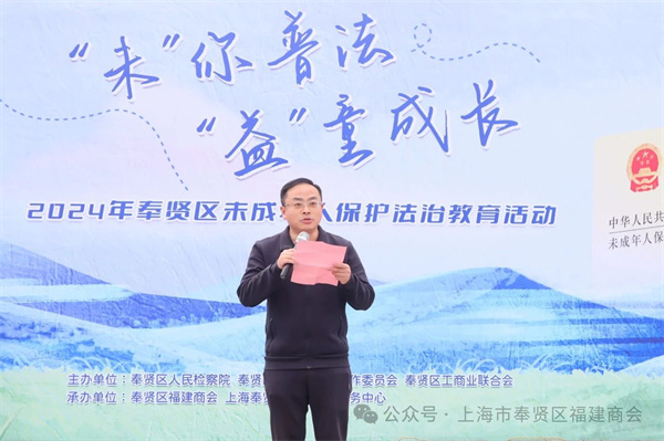 奉贤区委统战部副部长、区工商联党组书记余仲威发表了热情洋溢的讲话。他指出,我们不是生活在一个和平的时代,而是生活在一个和平的国家,生活在祖国的温暖怀抱,要保护好、培养好我们的社会主义建设者和接班人。同时,他强调了培养未成年的社会主义法治观念的重要性,对活动的成功举办表示热烈祝贺。