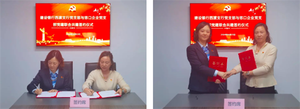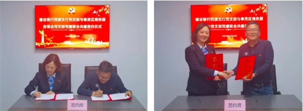 金章英和陈琳代表双方签署了建设银行西渡支行党支部与悠口企业党支部党建共建协议