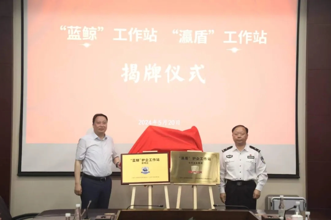 5月20日上午,崇明区工商联联合区公安分局在长兴企业集团举行“蓝鲸”护企工作站、“瀛盾”护企工作站联合揭牌仪式。崇明区副区长、区公安分局党委书记、局长沈炼出席揭牌活动并讲话。活动中,区公安分局党委委员、副局长张冲,长兴企业集团党委书记、董事长张忠为“蓝鲸”“瀛盾”护企工作站揭牌。区公安分局经侦支队介绍了两大护企工作站的相关情况及运作模式。区委统战部副部长、区工商联党组书记施卫东主持揭牌仪式。