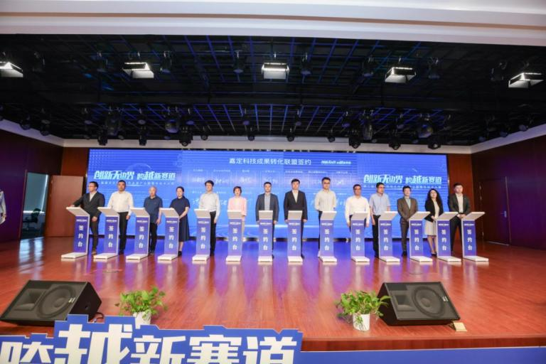 开幕式上,发起成立了嘉定科技成果转化联盟。区工商联副主席、区青年企业家协会执行会长、西上海(集团)有限公司董事长潘厚泉,区工商联副主席、区女企业家协会会长、上海谷利特企业发展有限公司总经理陈阳,区工商联执委、嘉定区青年创业者联谊会副会长、上海翼伽企业管理咨询有限公司董事长杨毅佳上台参与科技成果转化联盟签约。