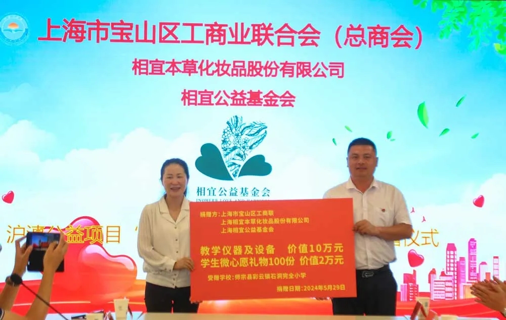 相宜本草化妆品股份有限公司(相宜公益基金会)向彩云镇石洞完全小学捐赠价值10万元的教学仪器和设备以及100份微心愿礼物,用于改善学校的办学条件。后续基金会将根据微心愿认领活动中回收的心愿卡内容,为100名学生点亮梦想之光,让爱心与温暖持续传递。