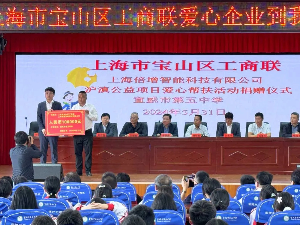 在宣威市第五中学爱心助学捐赠仪式上,上海倍增智能科技有限公司向宣威市第五中学捐赠奖助学金10万元,助力宣威教育事业,鼓励优秀学子努力进取,勇于面对挑战,在求知的道路上不断前行。