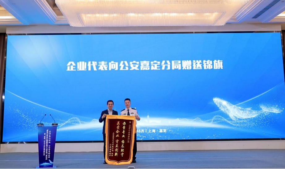 蔚来公司联合创始人、总裁秦力洪向区公安分局赠送锦旗,以表达对“企业守护神”的诚挚感谢,区公安分局党委副书记、政委朱旭光接受锦旗。