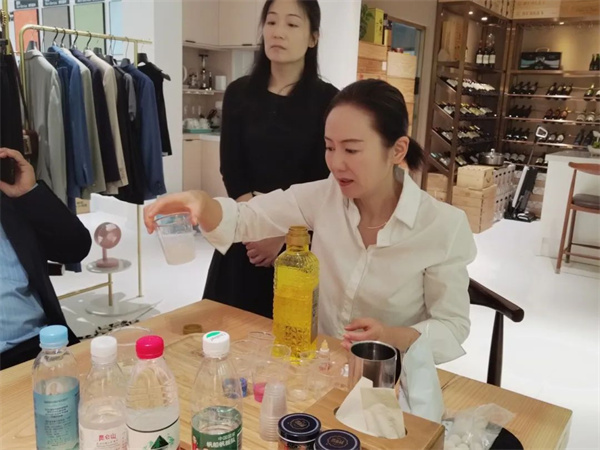 上海贞启实业有限公司总经理沈亚通过生动有趣的小实验向商会一行展示了沸石材料的独特性质和应用前景。