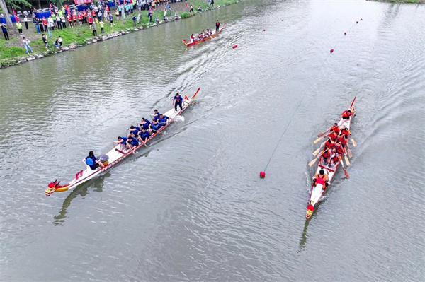 万民欢聚庆端午,百舸龙腾耀申龙。随着发令枪一响,每一支龙舟队都全力以赴,龙舟如离弦之箭般激情飞驰,参赛队员们奋力挥桡划水,每一下动作都充满力量,他们在河面上角逐比拼,各队之间你追我赶、互不相让,完美演绎了速度与力量的较量。以商会会员企业家以及会员企业员工组成的“江苏商会贲赋龙舟队”劈波斩浪、勇往直前,展现了苏商团结拼搏、奋勇争先的精神面貌。