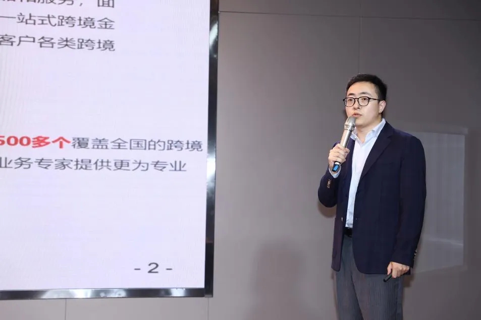 中国银行松江支行行长助理王旭以“聚焦跨境金融‘合力’,助力企业成功‘出海’”为主题进行发言。
