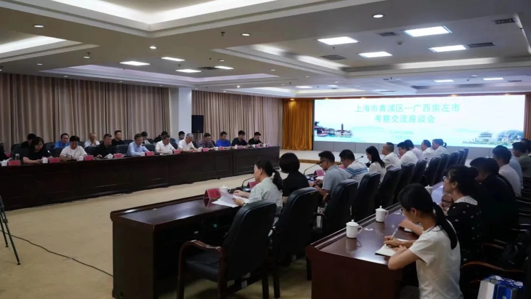 青浦区代表团与崇左市相关领导和部门进行了交流座谈,与会人员观看了崇左市招商宣传片、青浦区介绍片,并对各自特色项目进行了介绍,陆文崭、张得志分别作了讲话。