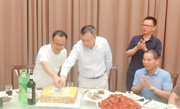 朱永福、郑豪共同为商会成立十六周年切蛋糕