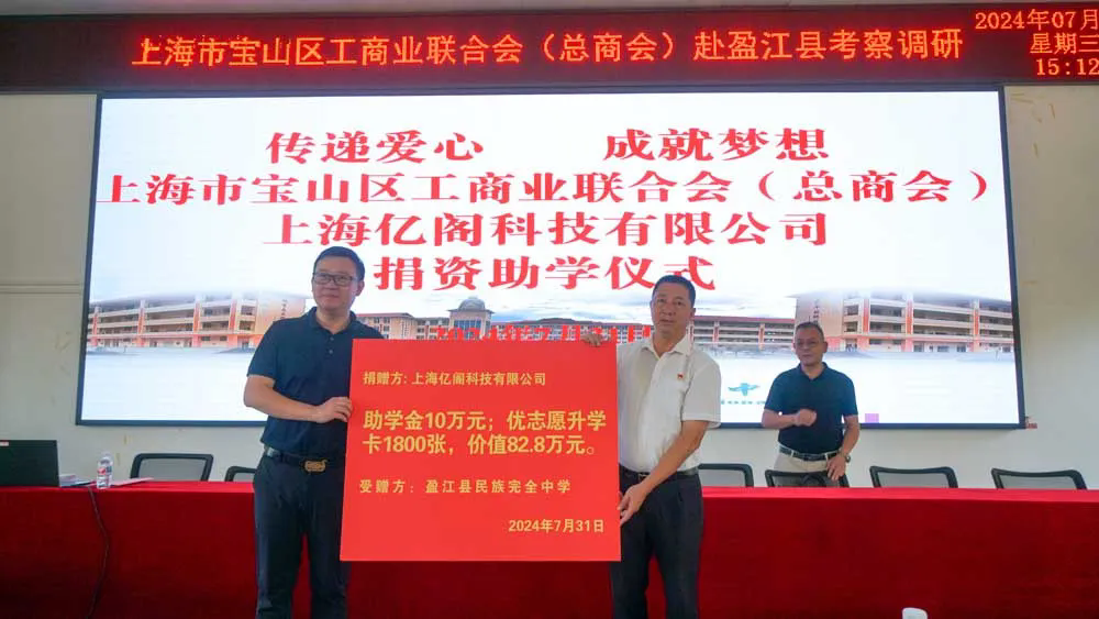 在盈江县民族完全中学爱心助学捐赠仪式上,上海亿阁科技有限公司向盈江县民族完全中学捐赠奖助学金10万元、优志愿升学卡1800张(价值约82.8万元)助力盈江县教育事业发展,鼓励优秀学子努力进取,勇于面对挑战,在求知的道路上不断前行。