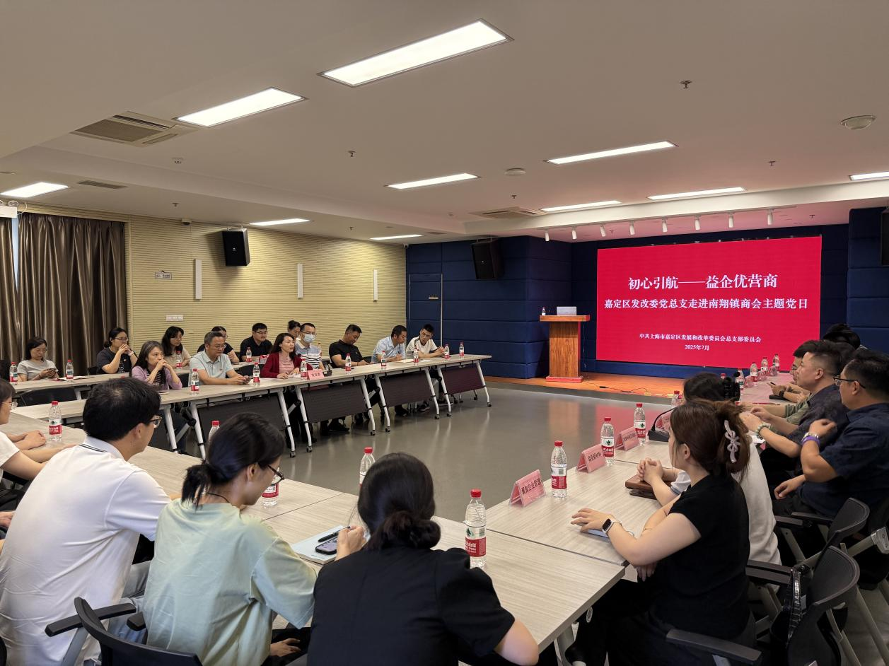近日,“初心引航 益企优营商”嘉定区发改委党总支走进南翔镇商会主题党日活动在东社区邻里中心举行。区发改委党组成员、副主任、党总支书记邓素芳,镇商会会长、优耐特斯压缩机董事长孙原野,镇商会秘书长沈葭出席会议。区发改委党总支党员、镇商会党员企业家代表30余人参加活动。