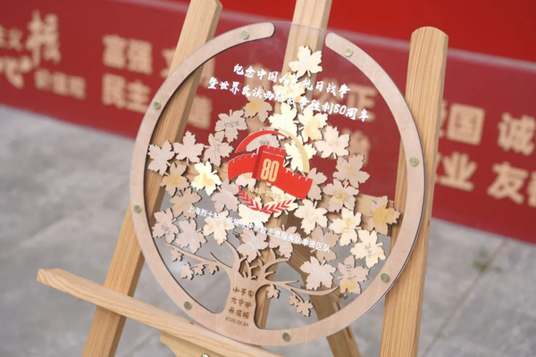 清晨的阳光洒在巍峨的纪念碑上,全体参与者手持菊花,神情庄重,按方阵肃立。活动在肃穆的氛围中拉开序幕。每一位参与者蘸取象征光辉与不朽的金色印泥,在“青春守护承诺板”的树叶形图样上郑重按下手印并签下姓名。一片片金色的“树叶”汇聚成壮观的“80”图案,镶嵌于承诺板中,寓意着对抗战胜利80周年的纪念,更象征着守护历史、传承精神的集体誓言在新时代蓬勃生长。随后,全场静默鞠躬,笛声长鸣,表达了对抗日先烈无尽的哀思与崇高的敬意。