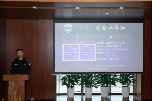区公安分局经侦支队情报技术室主任施洋介绍了“蓝鲸”护企工作站工作机制。区工商联携手区公安分局在平安金融大厦一楼的陆家嘴治安派出所平安圈层防控站内设立“蓝鲸”护企工作站,这是继去年在张江科学城商会设立“蓝鲸”护企工作站张江科学城站、今年8月在临港新片区设立“蓝鲸”护企工作站临港站后,成立的第三家“蓝鲸”护企工作站。“蓝鲸”护企工作站在实践中逐步完善更新了法律咨询、普法讲座、证件办理、公安业务办理、沟通协调等服务,并采取线上线下相结合的方式,为企业解决了许多实际问题,以法治护航区域发展。