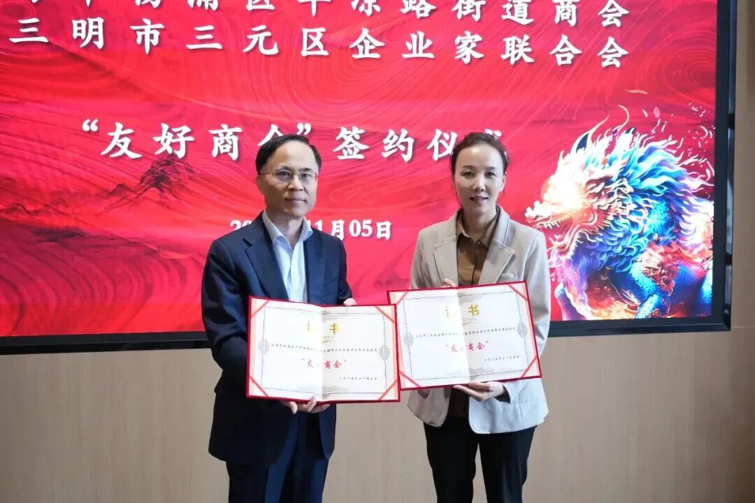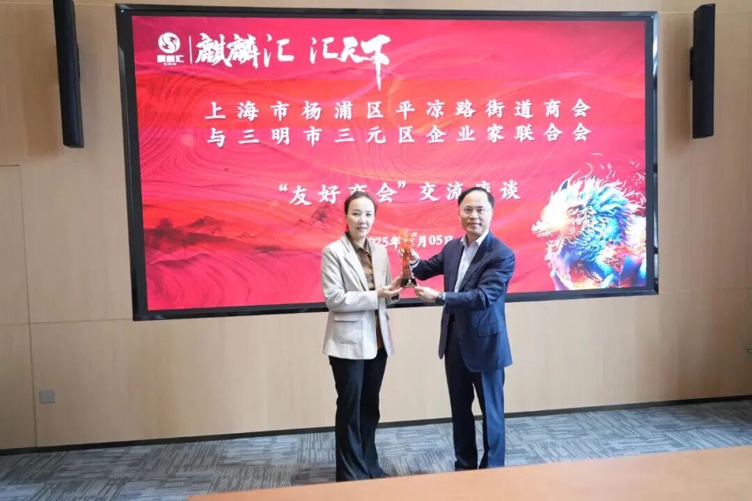 随后,“友好商会”结对仪式在上海三明大厦举行。在与会人员的共同见证下,双方会长郑重签署《上海市杨浦区平凉路街道商会与三明市三元区企业家联合会“友好商会”合作协议书》并互赠礼物。该协议以“资源共享、优势互补、市场运作、合作共赢”为原则,明确在信息互通、活动共建、服务协作、文化交流、公益联动等方面深化合作,建立常态化沟通机制,在企业合作、市场开拓领域搭建共享平台,助力两地企业协同发展。
