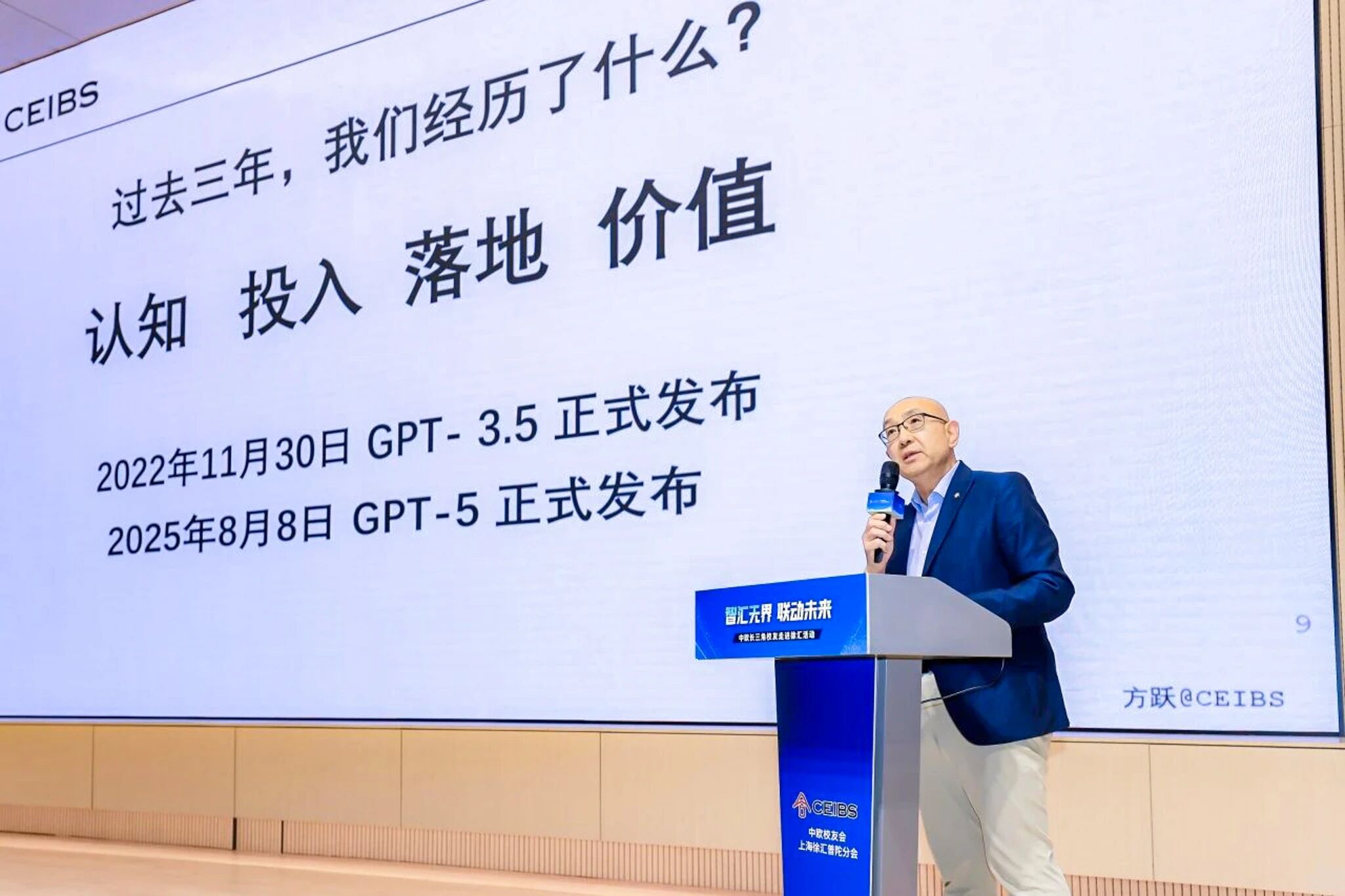 中欧国际工商学院方跃教授以《AI带来产业升级的新机遇》为题,剖析了AI如何重塑产业格局与企业竞争力。