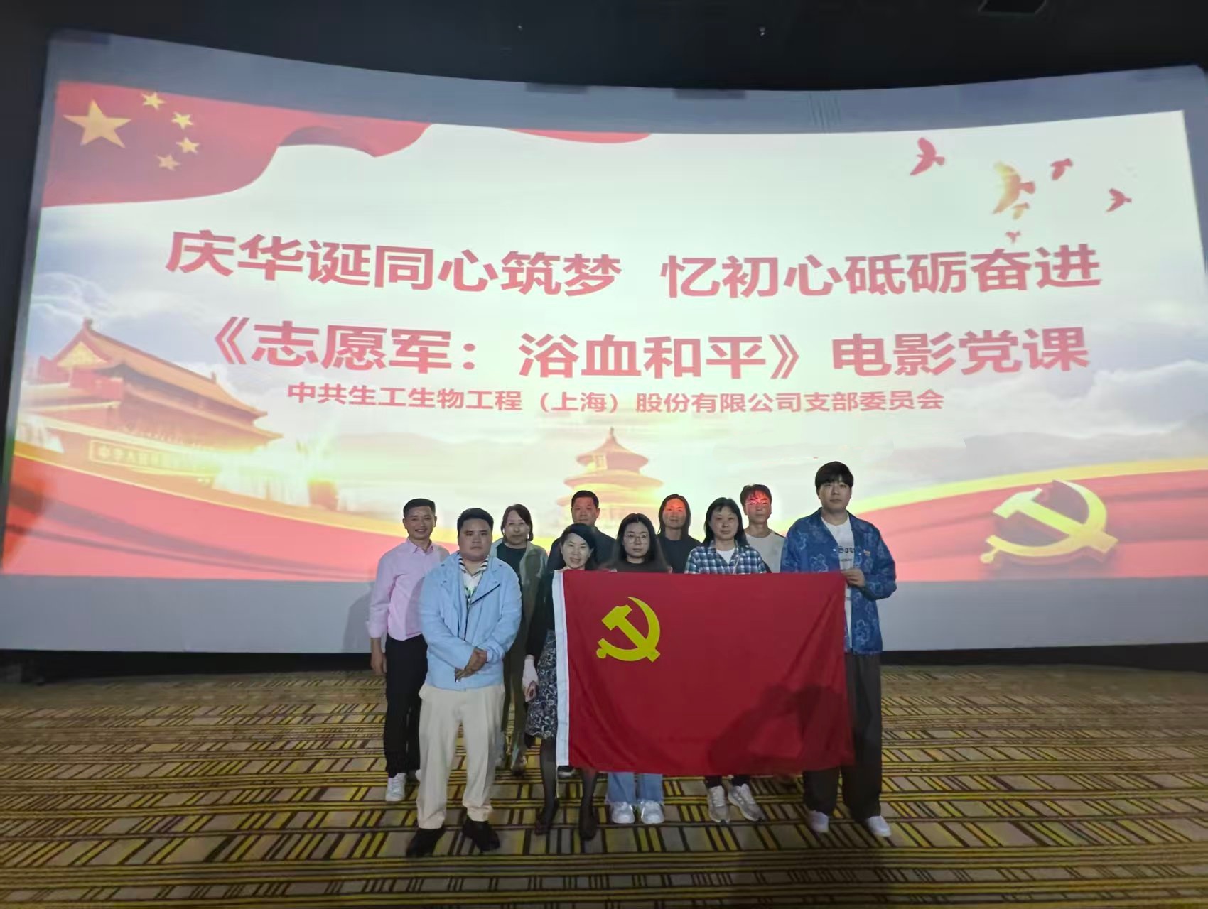 “庆华诞同心筑梦,忆初心砥砺奋进”,松江区车墩镇商会会员企业生工生物党支部组织17名党员沉浸式观看红色电影《志愿军:浴血和平》,重温抗美援朝时期的艰难博弈与浴血奋战,引导党员们深切缅怀革命先烈,赓续红色血脉。党员们纷纷感慨:上甘岭战役中,志愿军战士们在冰天雪地中啃着冻土豆,却依然冲锋陷阵,用血肉之躯坚守阵地,每一个人都是平凡而伟大的英雄。生活在和平年代,更要铭记历史,弘扬伟大抗美援朝精神,以实际行动践行爱国情怀,传递中国和平理念,让英雄精神在新时代焕发光彩。