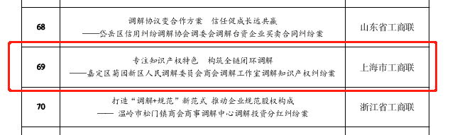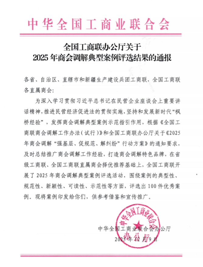 为深入学习贯彻习近平总书记在民营企业座谈会上的重要讲话精神,推进民营经济促进法的贯彻实施,发挥商会调解典型案例示范指引作用,在省级工商联、全国工商联直属商会择优推荐的基础上,全国工商联开展了2025年商会调解典型案例评选活动,围绕案例的典型性、规范性、新颖性、可读性、示范性等方面,评选出100件优秀案例,其中,《专注知识产权特色 构筑全链闭环调解——嘉定区菊园新区人民调解委员会商会调解工作室调解知识产权纠纷案》成功入选。
