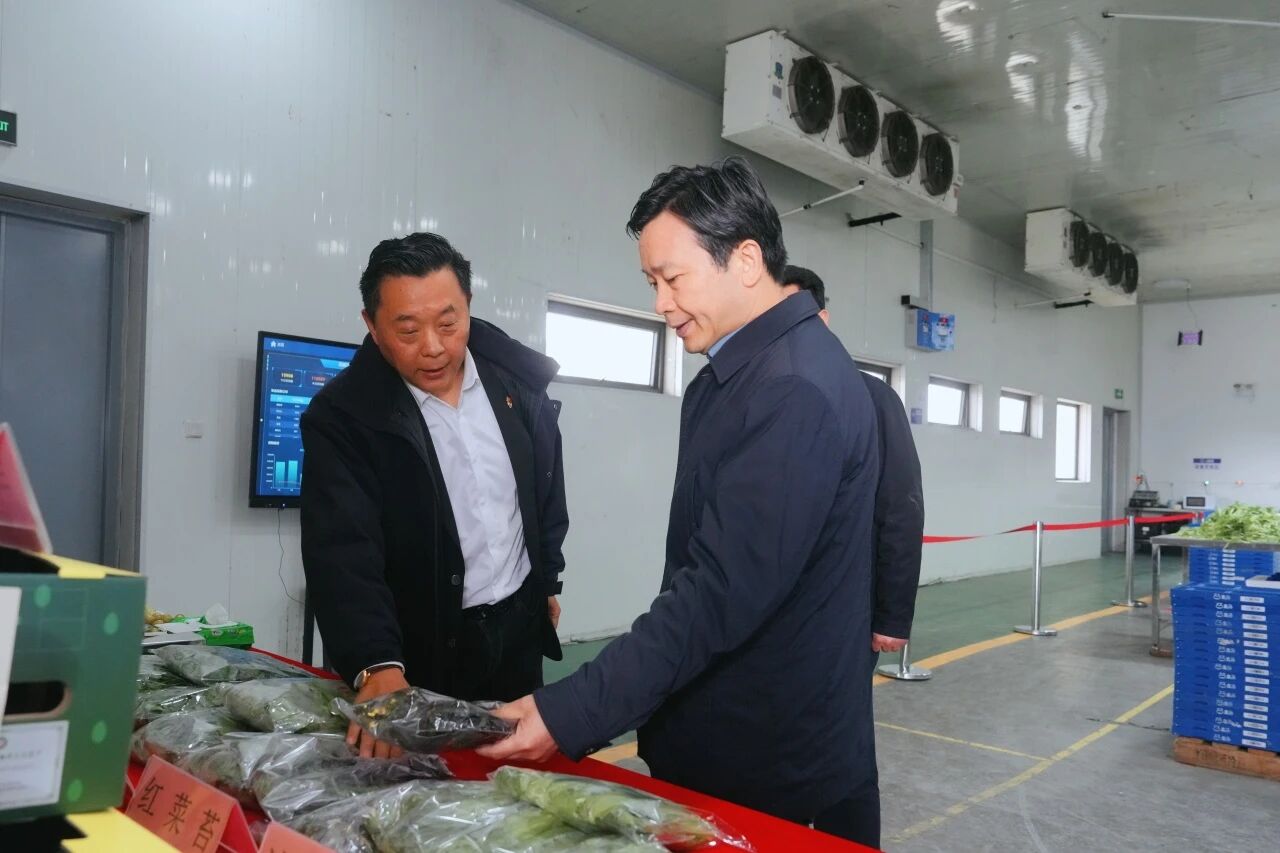 吴金城调研位于牌楼村的高标准蔬菜生产基地,进入暖棚察看蔬菜培育、种植情况,并了解企业产供销一体化模式建设成果。