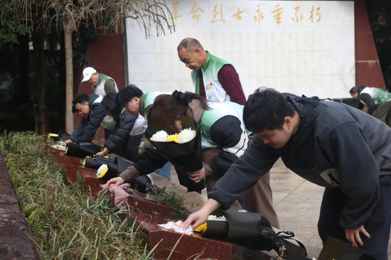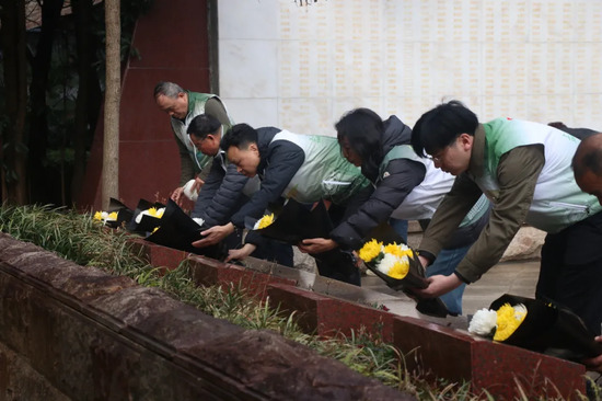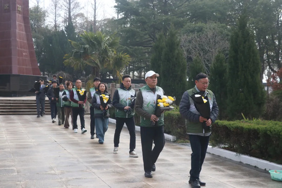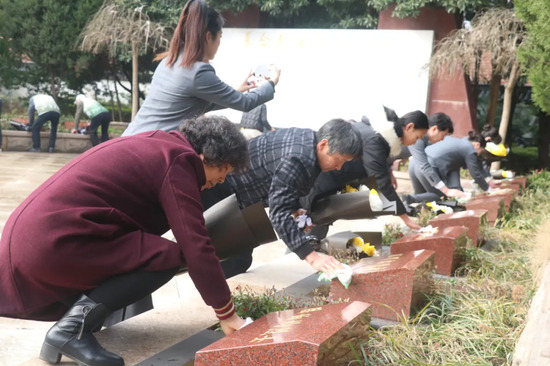接着,大家缓步绕行,瞻仰烈士墓区,并依次向革命烈士敬献手中鲜花,花瓣轻落,寄托着后人的深切怀念。