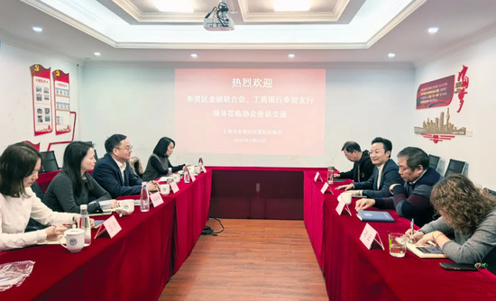 近日,奉贤区金融联合会会长、工商银行奉贤支行行长岳延峰,工商银行奉贤支行副行长吴骏等区金融联合会和工商银行奉贤支行相关负责人,来到奉贤区民营经济协会,就新型金融组织更好服务民营企业议题进行沟通交流。区民营经济协会会长陈亮、秘书长倪康人热情接待并开展座谈。
