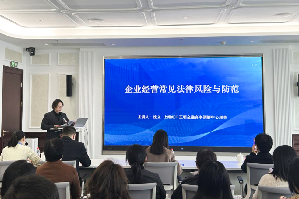 正明金融商事调解中心理事沈立,调解员姜健分别就《企业经营常见法律风险与防范》和《商事调解的优势及典型案例》进行主题分享。