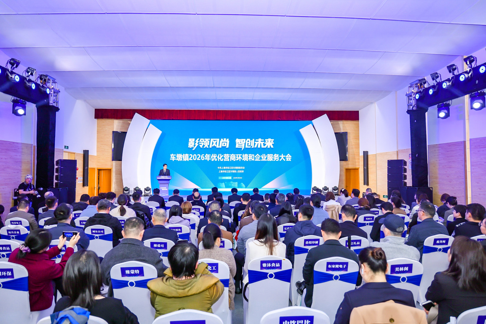 3月26日下午,松江区车墩镇2026年优化营商环境和企业服务大会顺利举行,逾30家镇商会会员企业受邀参会。本次大会以“影领风尚 智创未来”为核心主题,立足“十五五”开局起步的全新节点,全力打造“创新车墩、影视车墩、品质车墩、幸福车墩”,为松江发展蓄势赋能、增添动力。