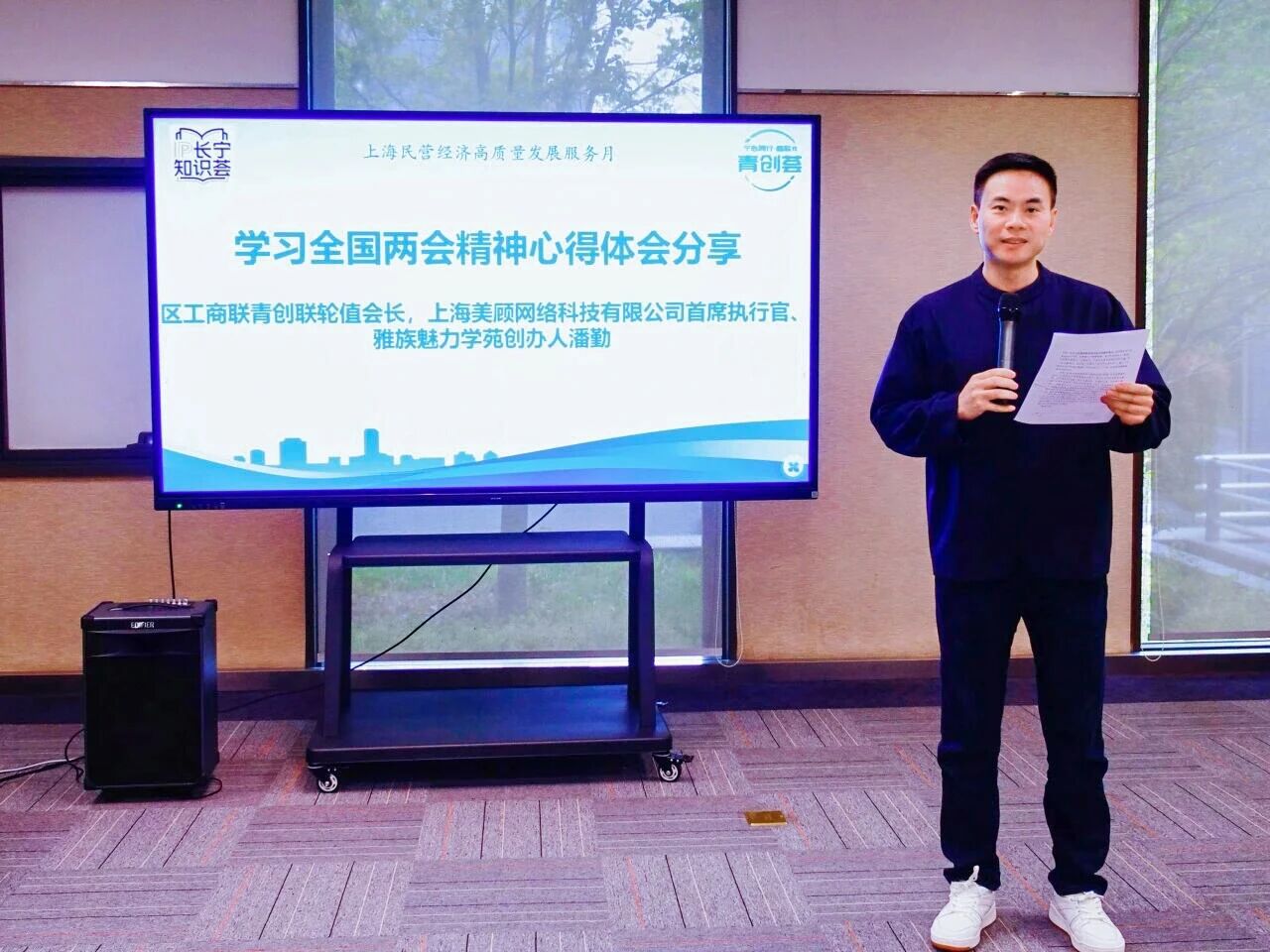 区工商联青创联轮值会长、上海美顾网络科技有限公司首席执行官、雅族魅力学苑创办人潘勤聚焦知识产权保护方向,向与会青年企业家作学习全国两会精神心得体会分享。