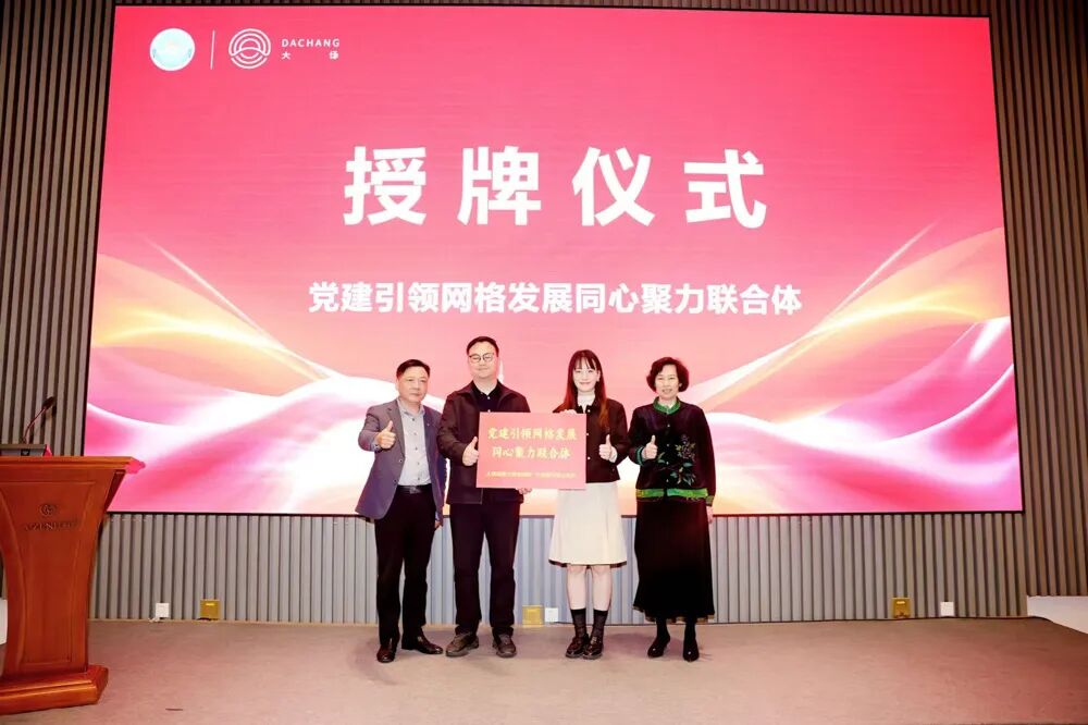 为进一步深化党建联建,在朱建超和张杲的见证下,大场镇城市建设管理事务中心副主任、第六综合网格临时党支部副书记宗培明与刘安琪共同上台,接受“党建引领网格发展 同心聚力联合体”授牌,标志着双方在党建引领下开启银企合作新模式。