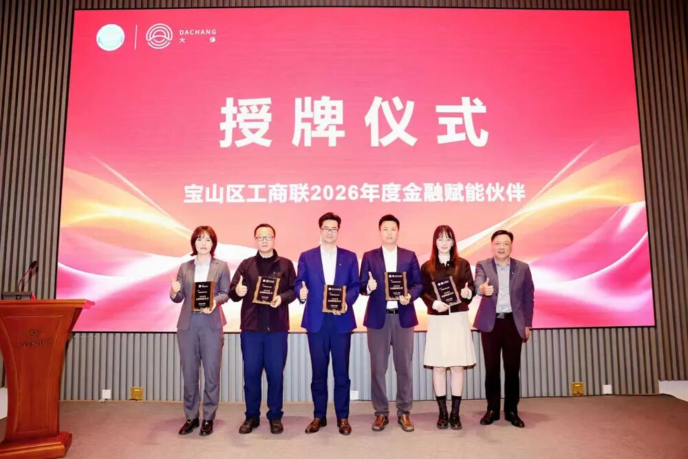 朱建超向中国银行宝山支行副行长吴暐、农业银行宝山支行副行长许还山、交通银行宝山支行副行长张伟俊、宁波银行宝山支行副行长刘安琪、泰隆银行宝山支行副行长黄庆双等银行代表授予“宝山区工商联2026年度金融赋能伙伴”称号。