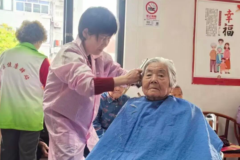 4位个体理发师手中剪刀翻飞,义务为65位老人理发,让他们精神焕发、面貌一新。